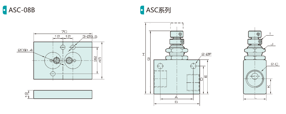 | ASC-08 | 26 | 36 | G1/4 | 22 | 27 | 4.3 | 49.7 | 56.5 | M6X0.5 | M12X0.75 | 12 | 18 |