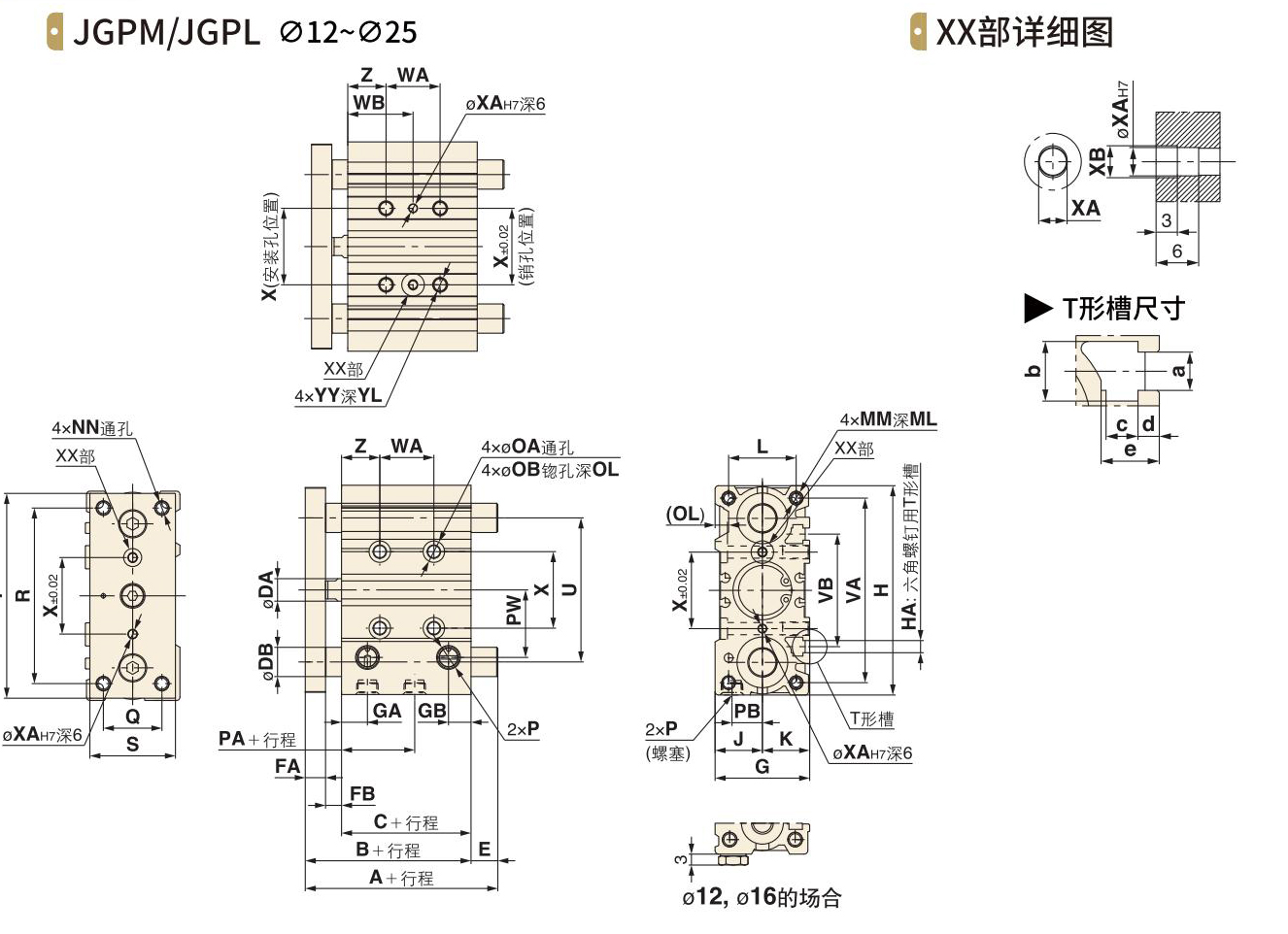 | 缸徑 (mm) | PB | PW | Q | R | S | T | U | VA | VB | WA | WB | X | XA | XB | YY | YL | Z | ||||||||