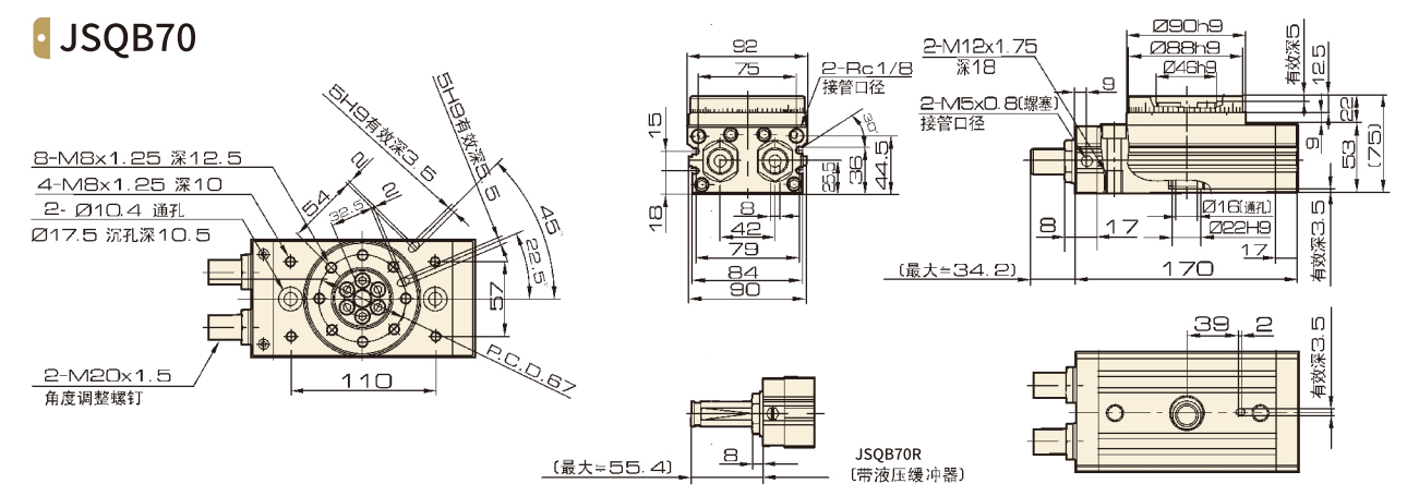 | JSQB20□ | 76 | 34 | 20.5 | 2 | M6x1 | 10 | M6x1 | 8.6 | 14 | 8.5 | 4H9 | 4.5 | 43 | 117 | 17H9 | 9 | 12 | 10.6 | 25 | 54 | 37 | 6.5 | 2.5 | 17 | 10 | 6 |