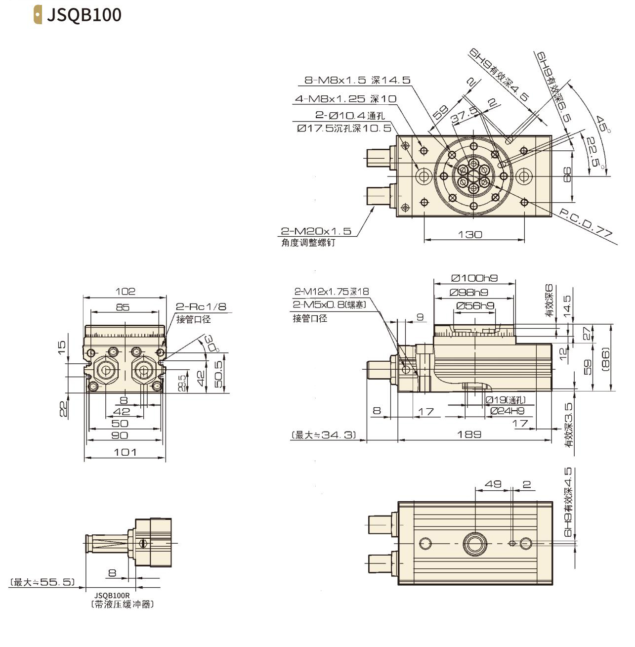 | JSQB50□ | 100 | 50 | 26.5 | 2 | M8x1.25 | 12 | M8x1.25 | 10.5 | 18 | 10.5 | 5H9 | 5.5 | 55 | 152 | 26H9 | 10 | 15.5 | 14 | 31.4 | 66 | 46 | 7.5 | 3 | 20 | 12 | 5 |