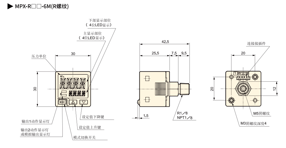 | 連接口徑 | M5內(nèi)螺紋+R(PT)1/8外螺紋 | ||