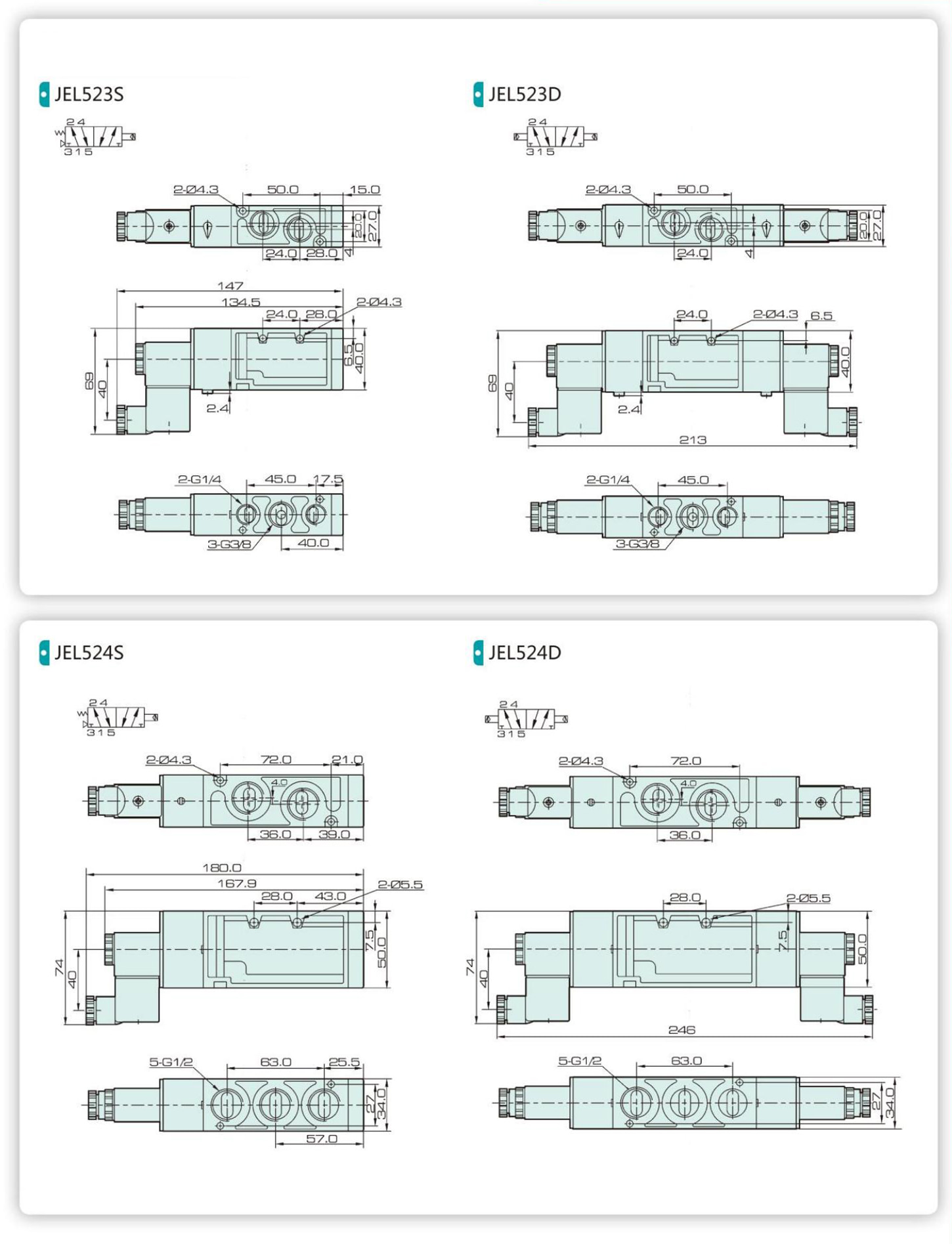 | 位置數(shù) | 二位五通 | 三位五通 | 二位五通 | 三位五通 | 二位五通 | 三位五通 | 二位五通 | 三位五通 | ||||