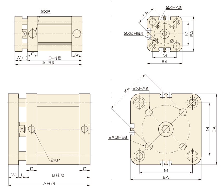 | 缸徑/符號 | 行程范圍(mm) | 附磁 | EA | M | HA | HB | KA | L | W | ||||